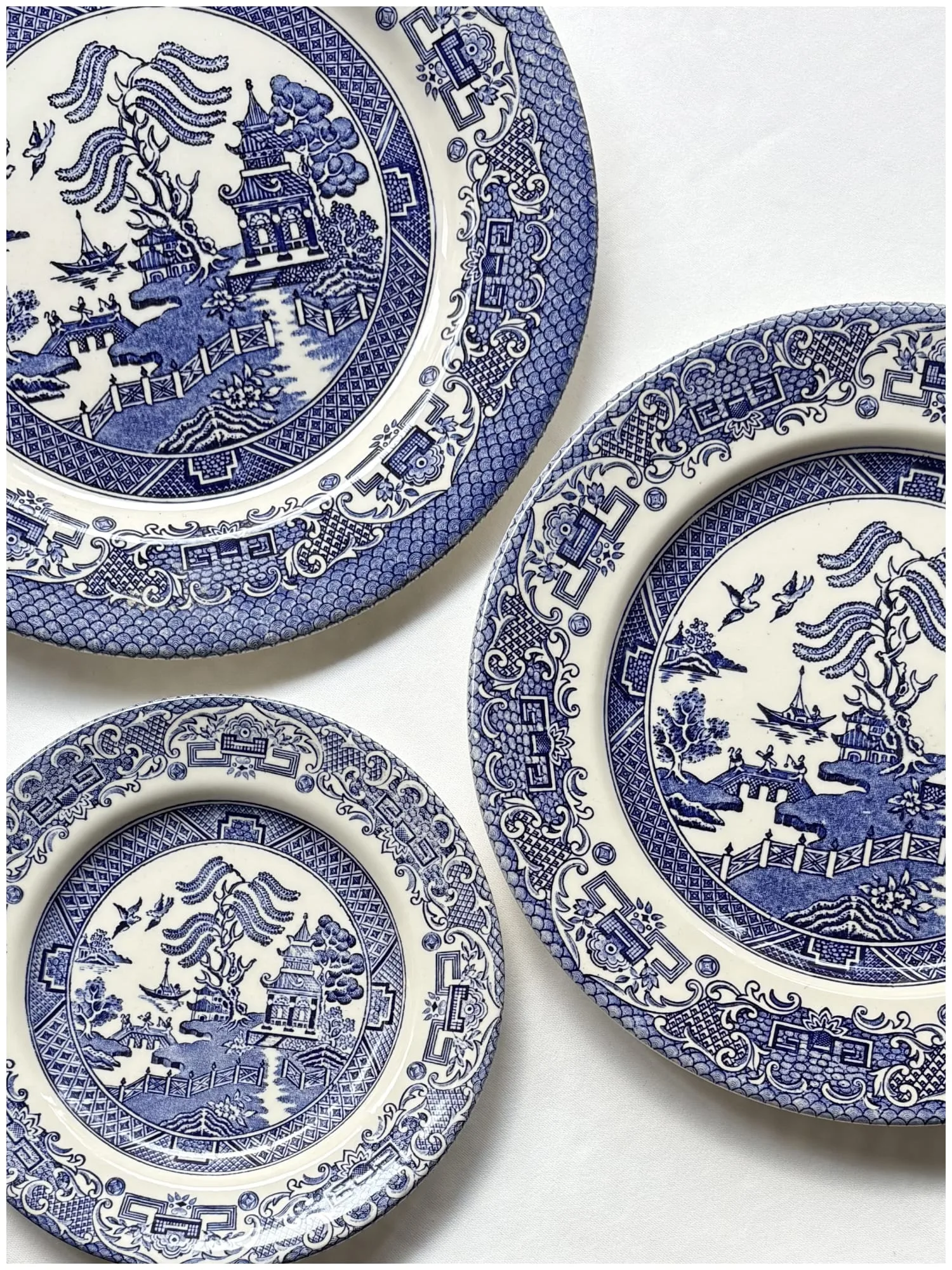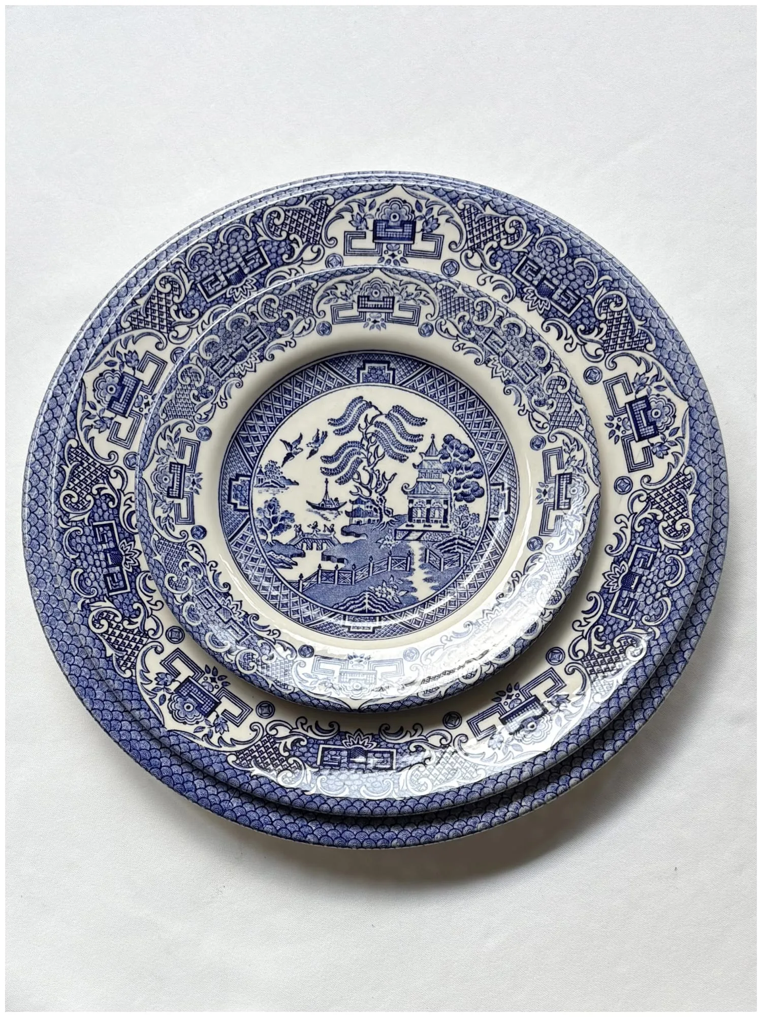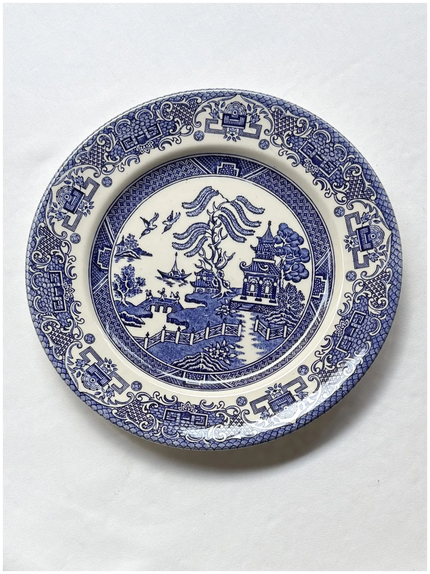 Porcelain plate featuring the iconic willow pattern in rich cobalt blue.