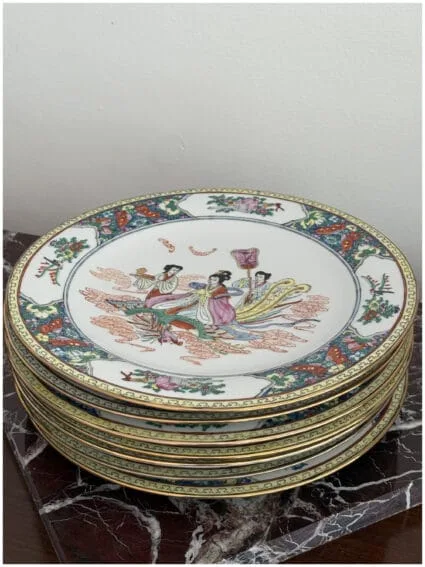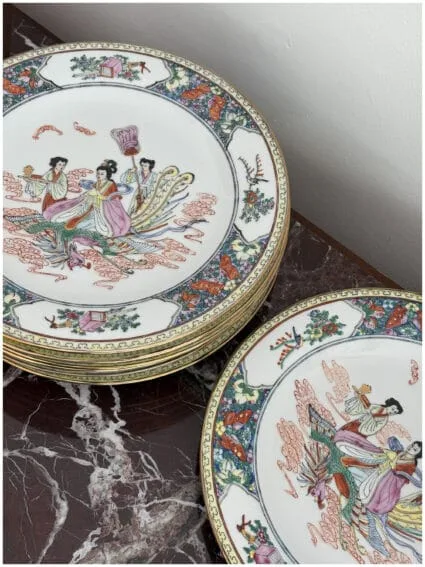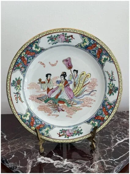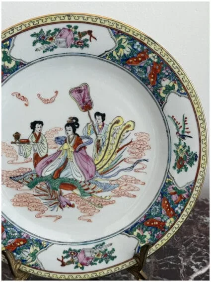 A China Porcelain plate, hand-painted with a detailed scene of geishas and traditional decorative motifs. Rich colors and fine artistry, highlighted with symbolic elements around the rim. Perfect as a statement piece for display or as part of a collection.