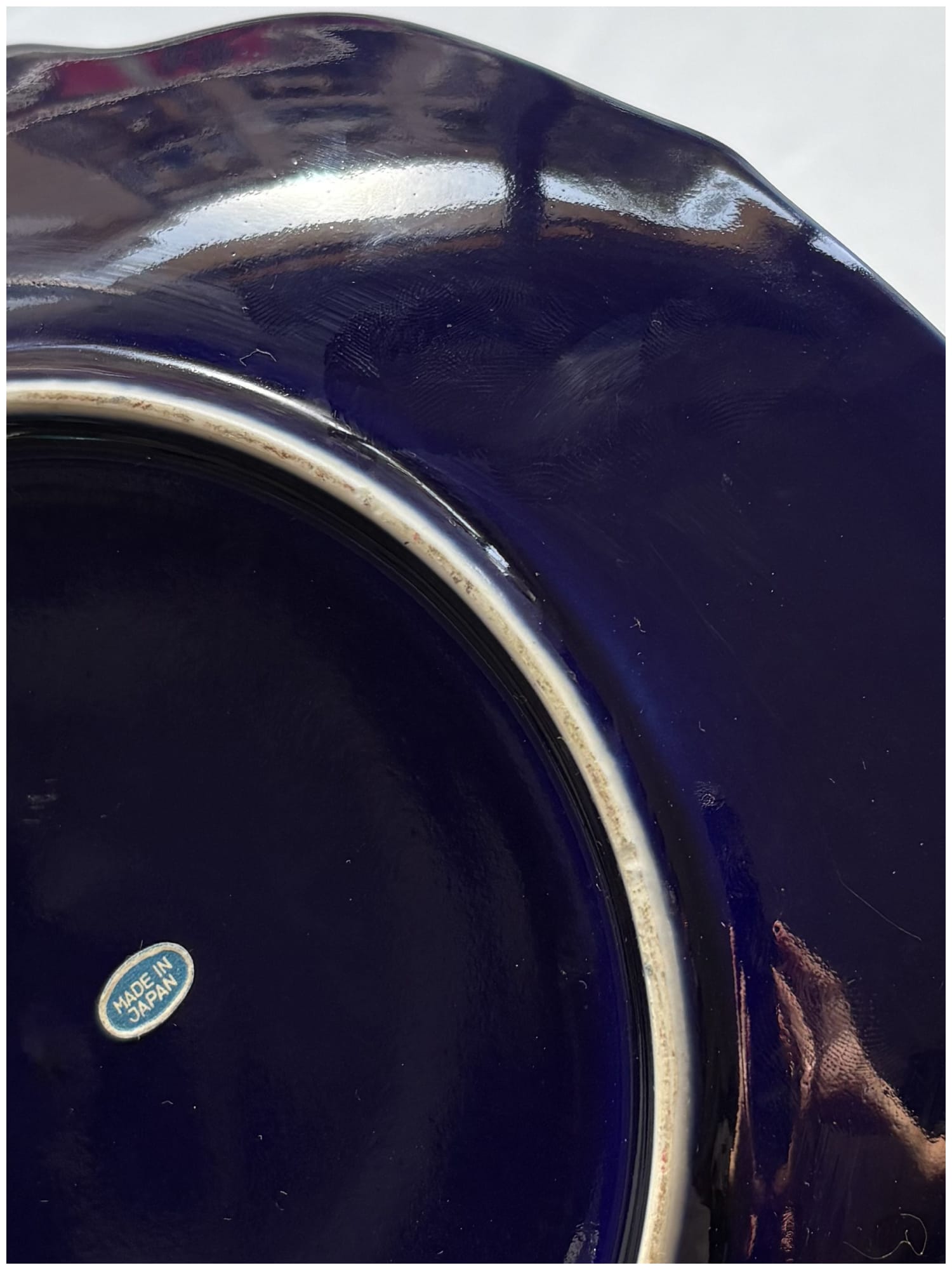 A scalloped-edge ceramic plate featuring a deep navy blue glaze with an intricate multicolor floral-and-fan motif at the center, accented with gold detailing. Marked Made in Japan on the back.