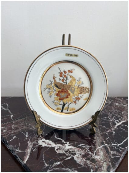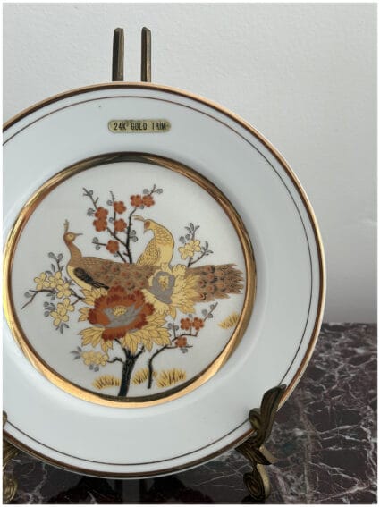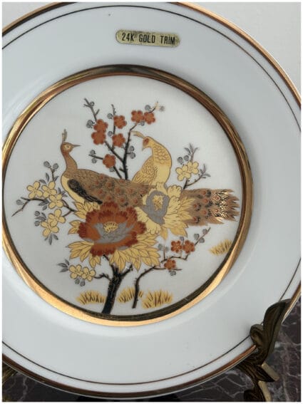 Porcelain Plate 24K Gold Trim with Peacock and Floral Design