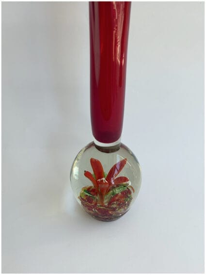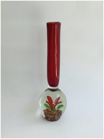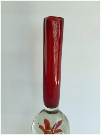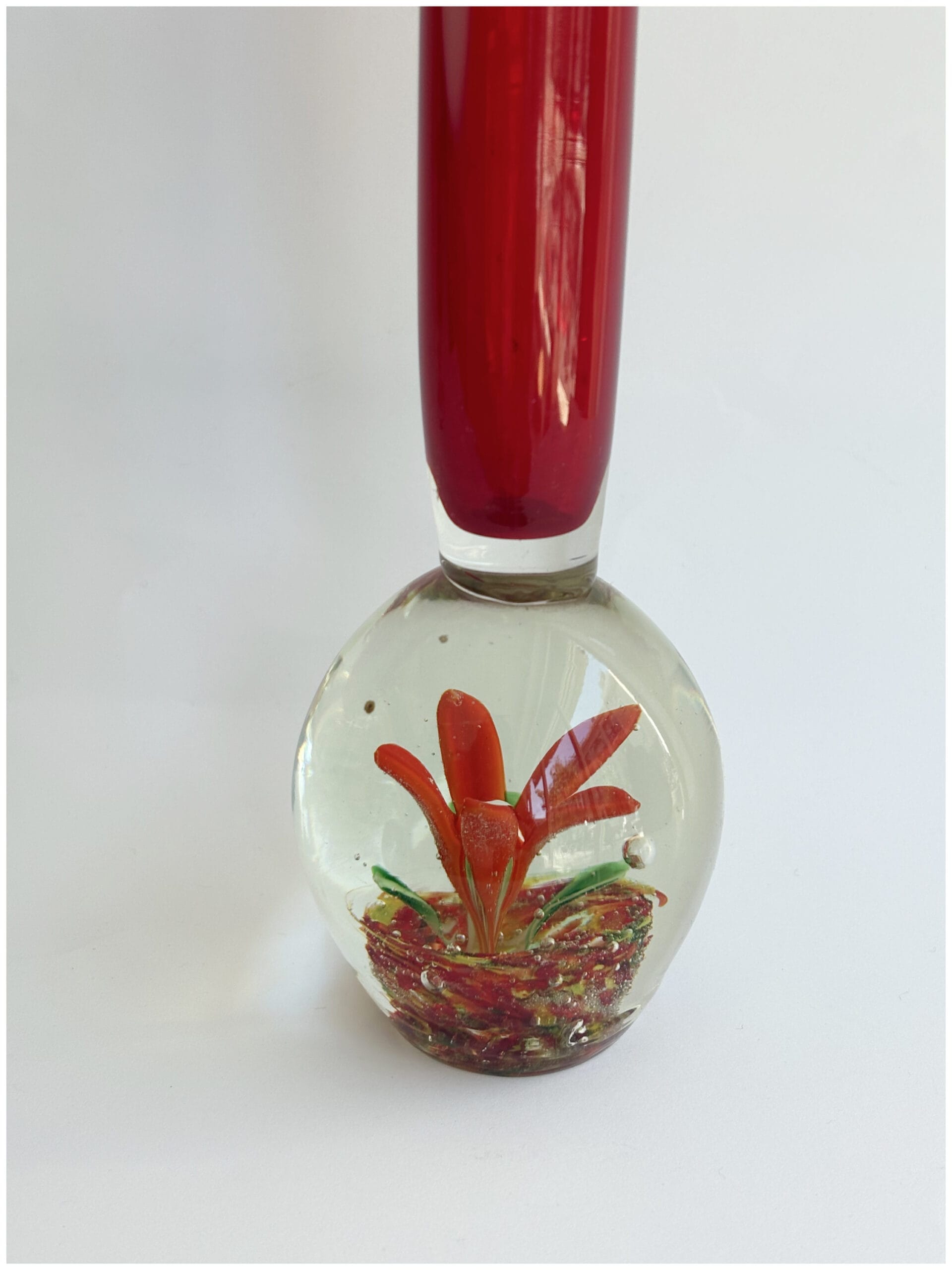 Murano glass vase with a bold red stem and a clear rounded base encasing a delicate floral motif. Handblown in Italy, this unique piece combines timeless craftsmanship with artistic flair.