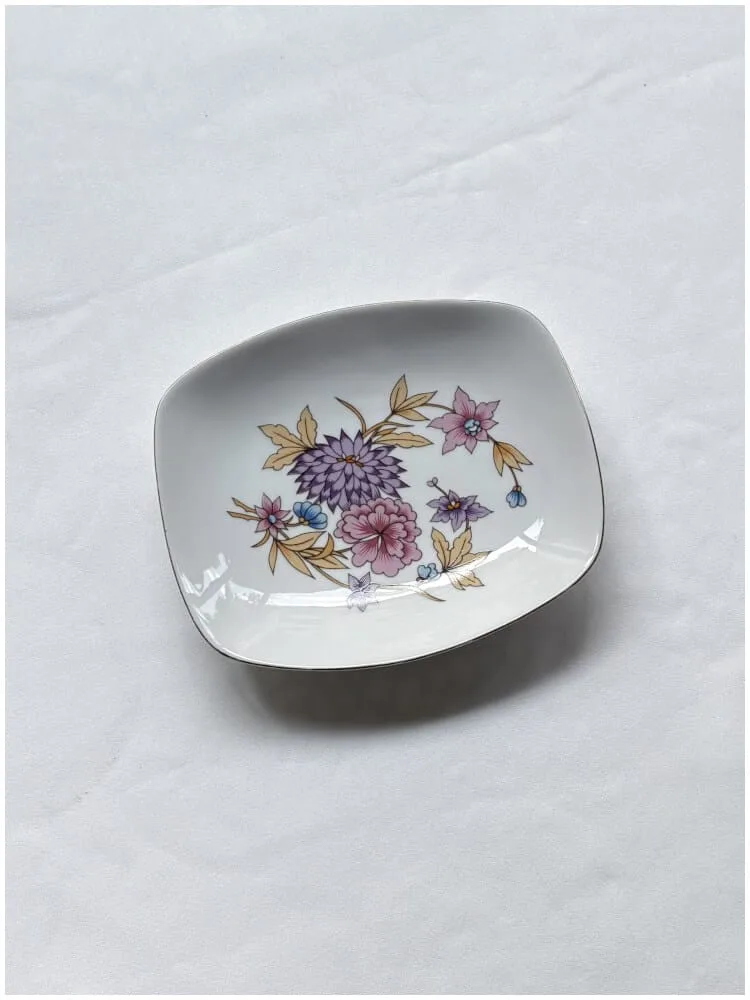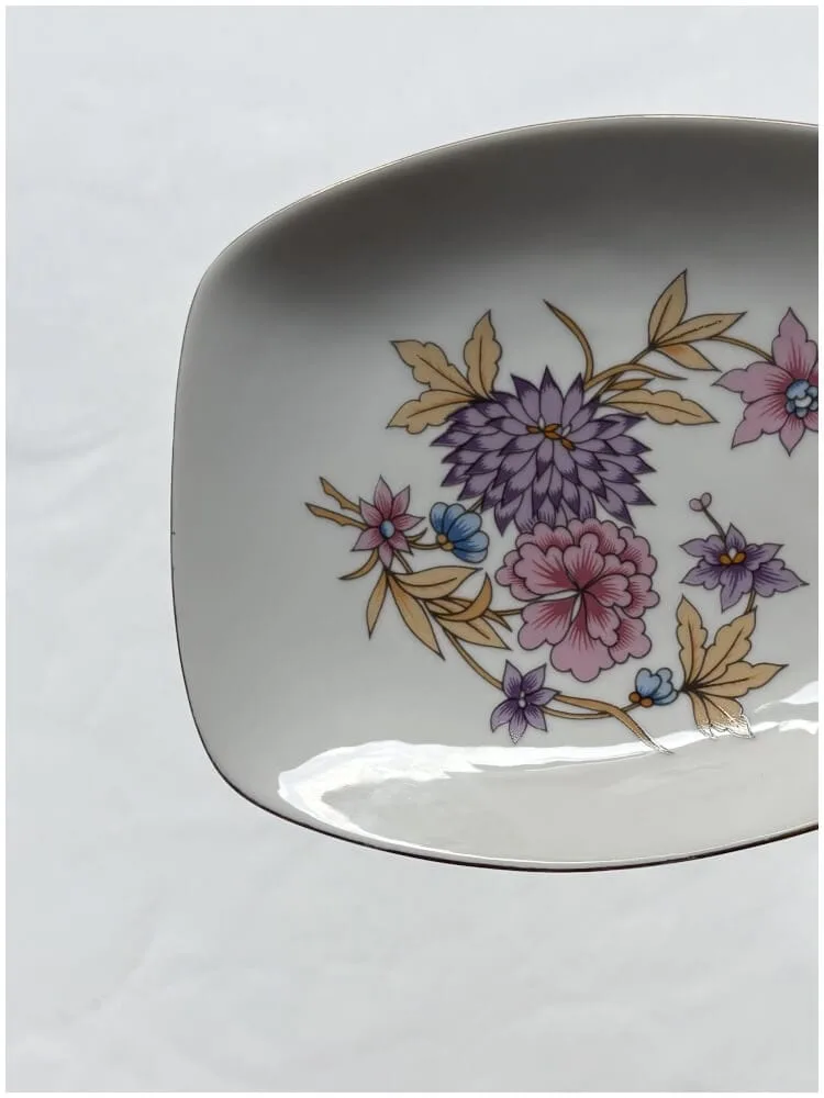 Petite rectangular dish with pastel floral design and fine gold trim.