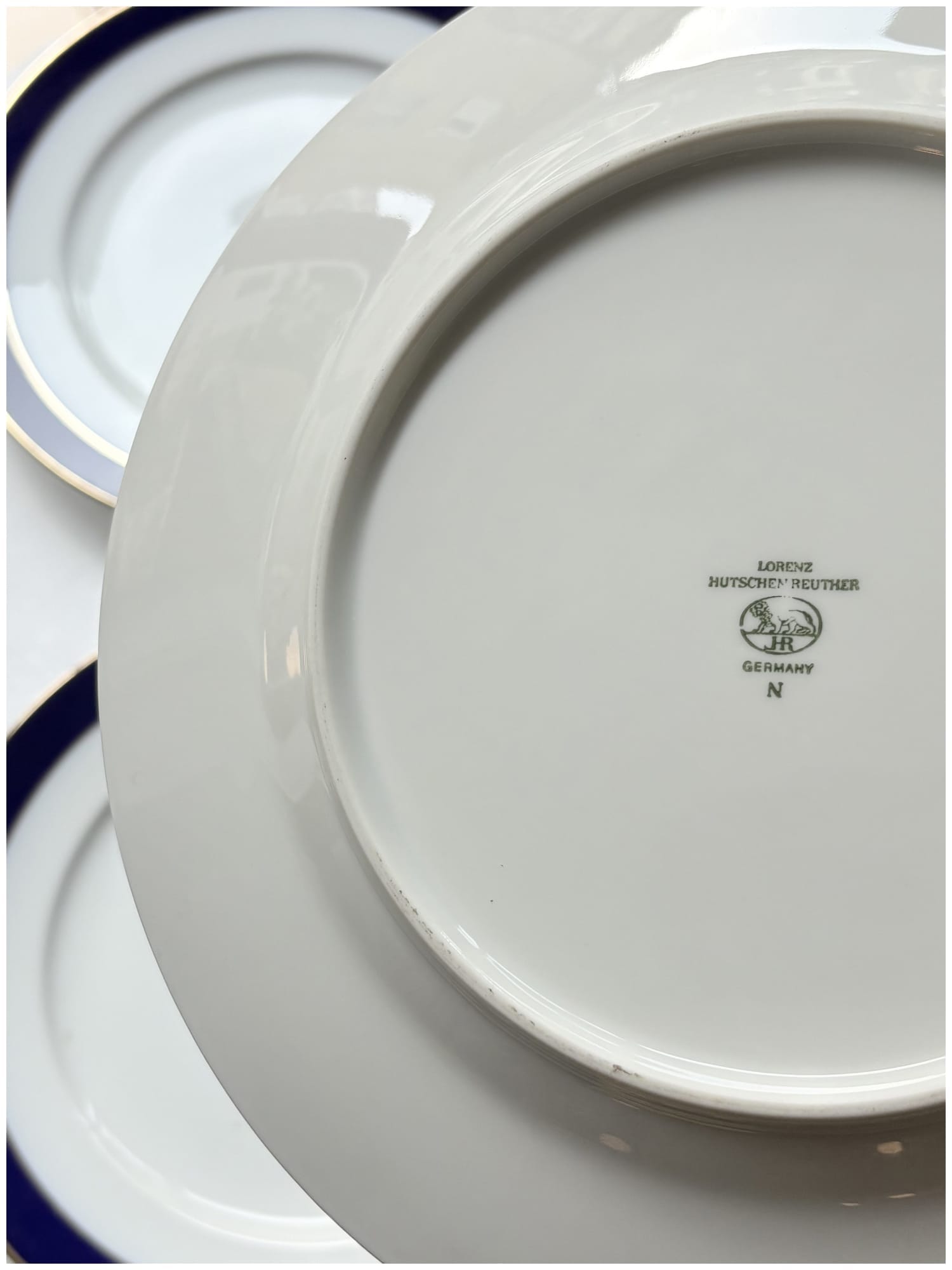 Small white plate featuring a navy rim and delicate gold edging.