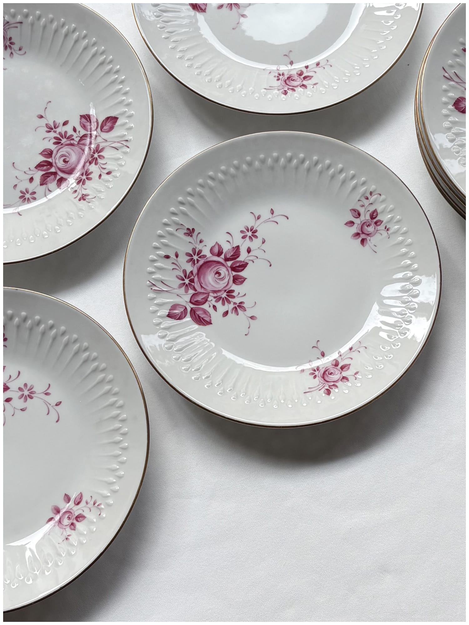 Vintage white plate with embossed rim, pink floral design, and fine gold trim